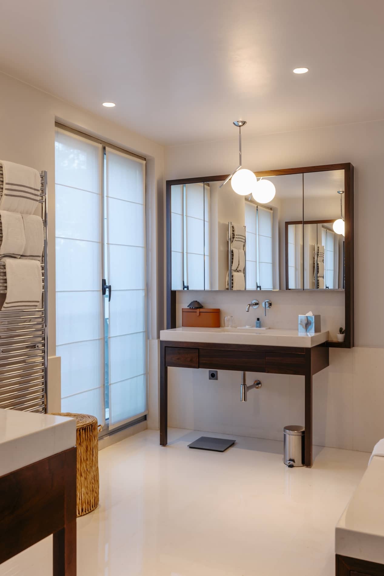 Le salon du Sky Penthouse offre de grands volumes baignés de lumière, avec une atmosphère sophistiquée et pourtant naturelle. Matières nobles, teintes chaleureuses et mobilier structuré créent un espace idéal pour se retrouver, recevoir, ou simplement savourer le calme, Paris en toile de fond.